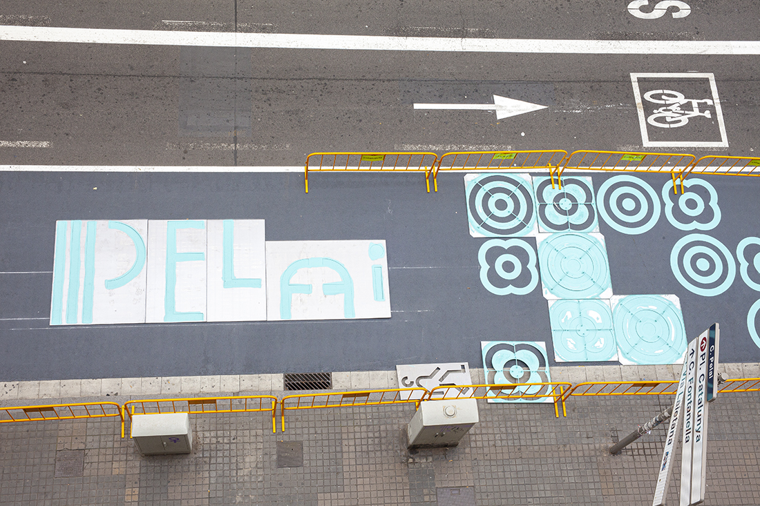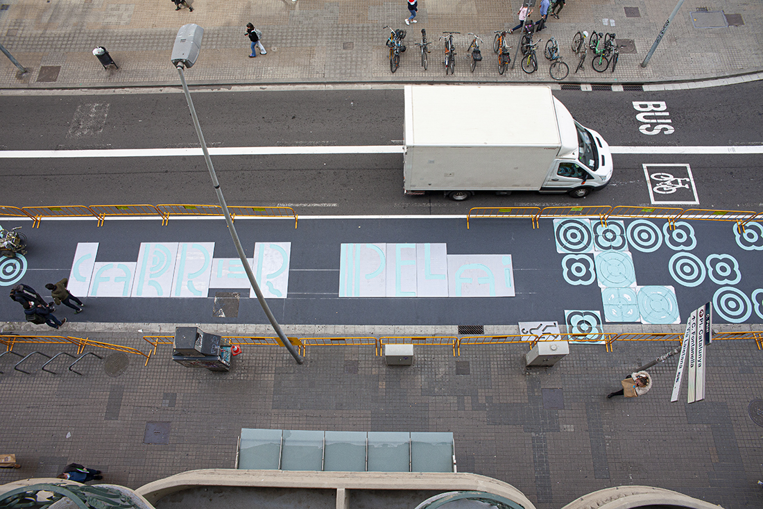 - Senyalització horitzontal amb pintura de color turquesa en tota la longitud del carrer, on s’ha destacat el tradicional símbol de la ciutat el “panot flor” i el nom del carrer.