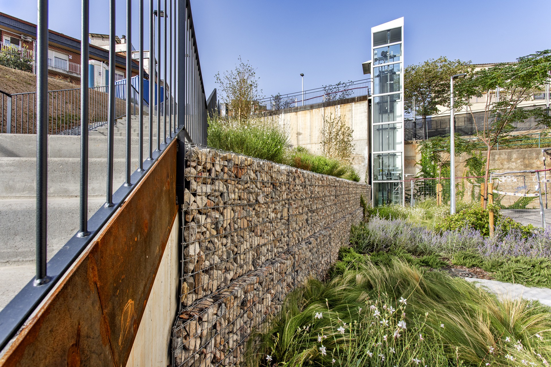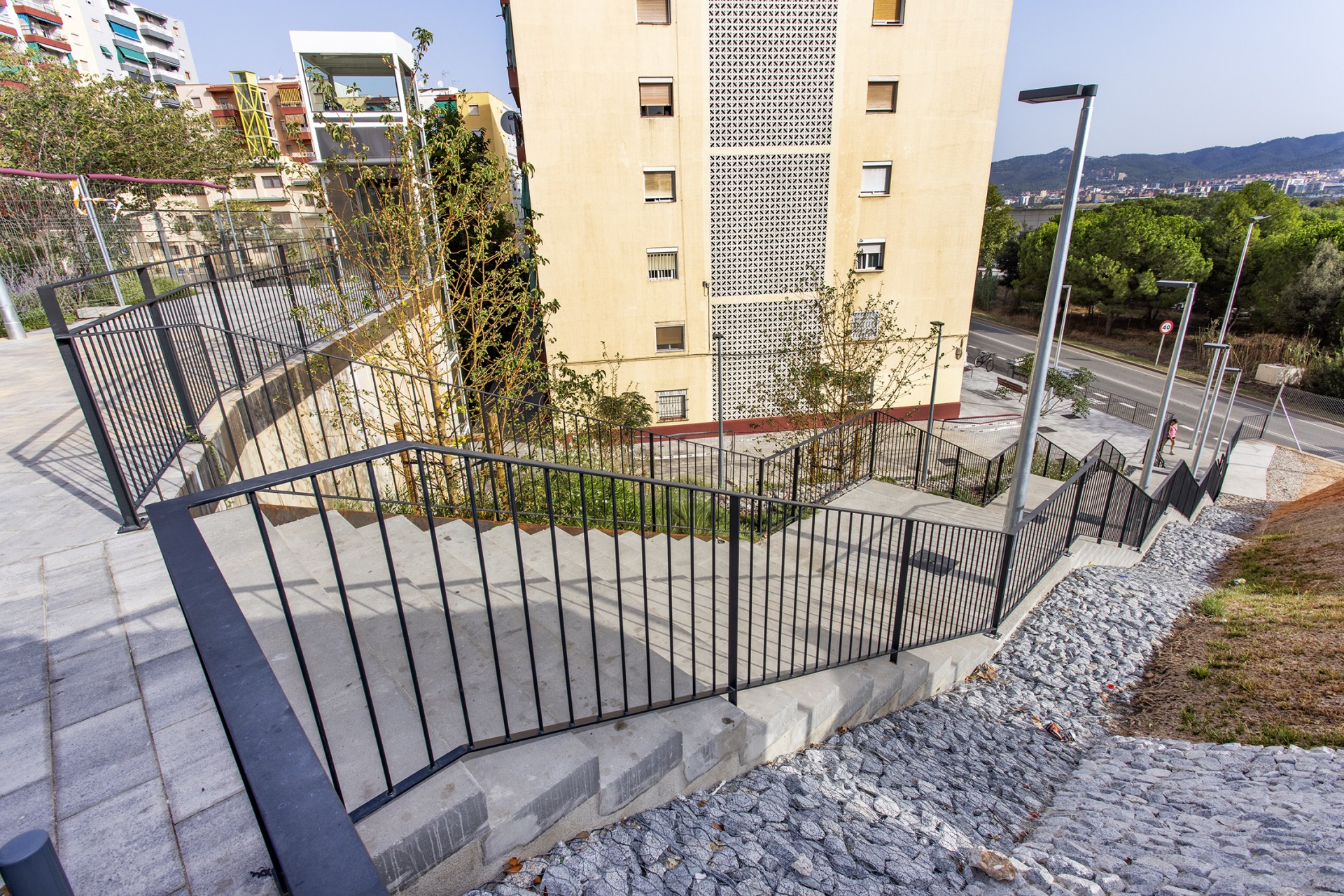 El tercer element de millora de l’accessibilitat és una escala, de cinc trams i tres replans, entre els carrers de Joan Burgada i d’Antoni Pujadas, salvant un desnivell de 9,5 metres.